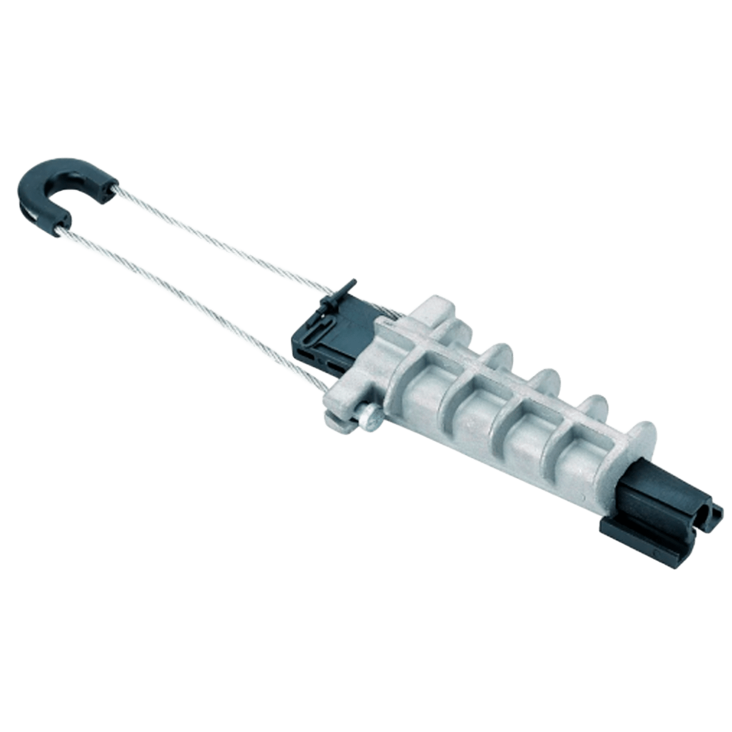 Анкерный зажим предназначен для крепления самонесущего оптического кабеля, монтируемого на опорах воздушной линии электропередачи, связи, городского электрохозяйства (уличного освещения, наземного электротранспорта), элементов зданий и сооружений.Корпус зажима изготовлен из крепкого алюминиевого сплава. Зажим имеет тросик из нержавеющей стали с полимерной накладкой, защищающей его от износа при креплении на кронштейне. Клинья зажима изготовлены из погодо- и ультрафиолетостойкого полимера.