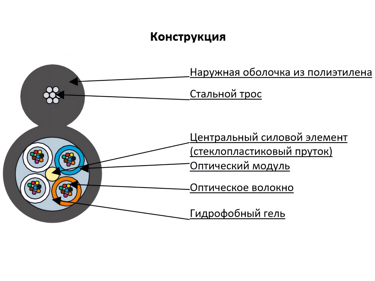 Кабель содержит сердечник модульной конструкции с центральным силовым элементом из диэлектрического стержня, вокруг которого скручены оптические модули со свободно уложенным волокном. Свободное пространство в оптическом модуле заполнено гидрофобным гелем. В качестве подвесного элемента используется стальной трос. На оптический модуль и подвесной элемент накладывается оболочка из полиэтилена.