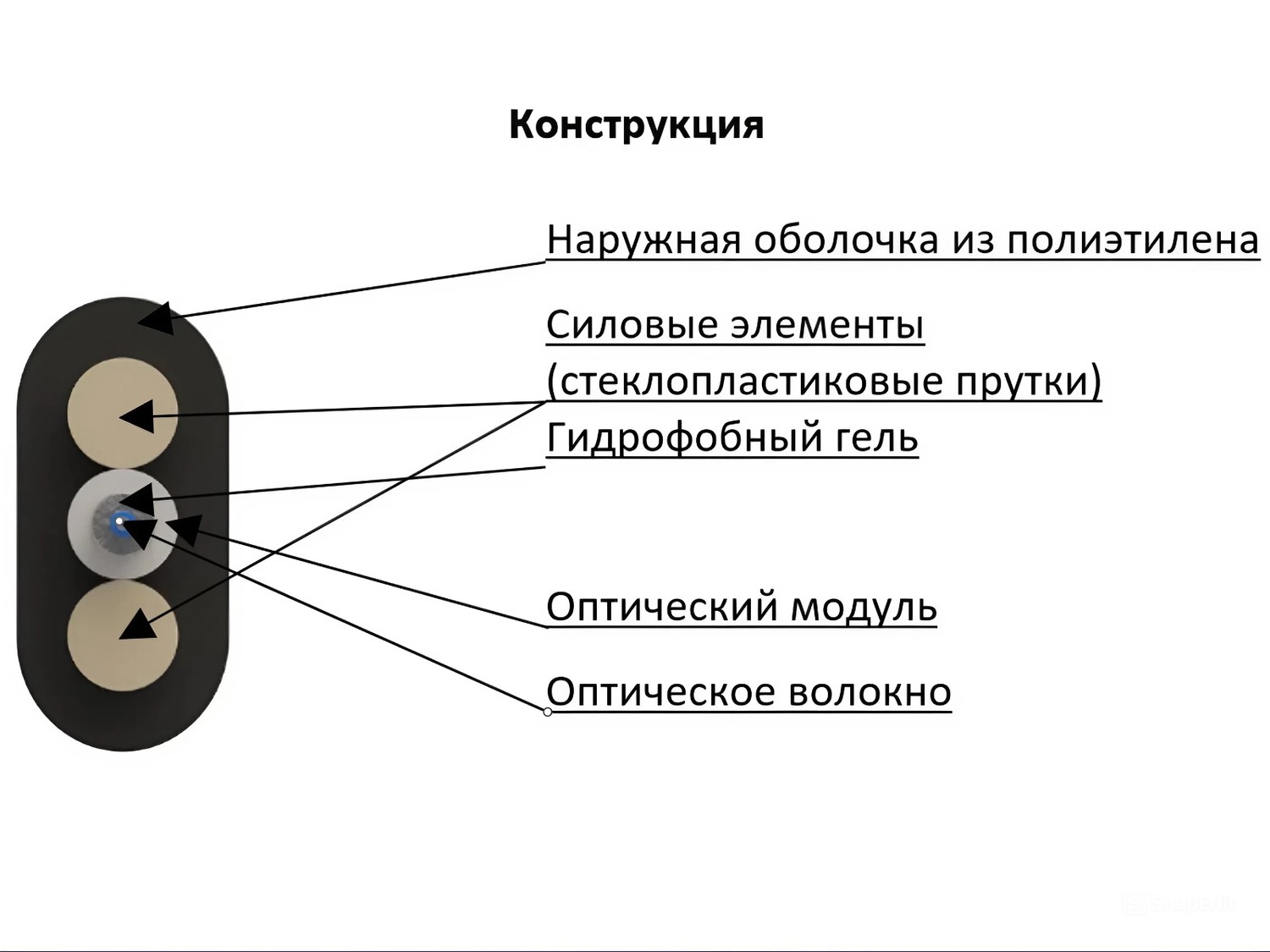 Кабель содержит оптический модуль со свободно уложенными волокнами. Свободное пространство в оптическом модуле заполнено гидрофобным гелем. В качестве силовых элементов используются два диэлектрических стержня. На оптический модуль и силовой элемент накладывается оболочка из полиэтилена.