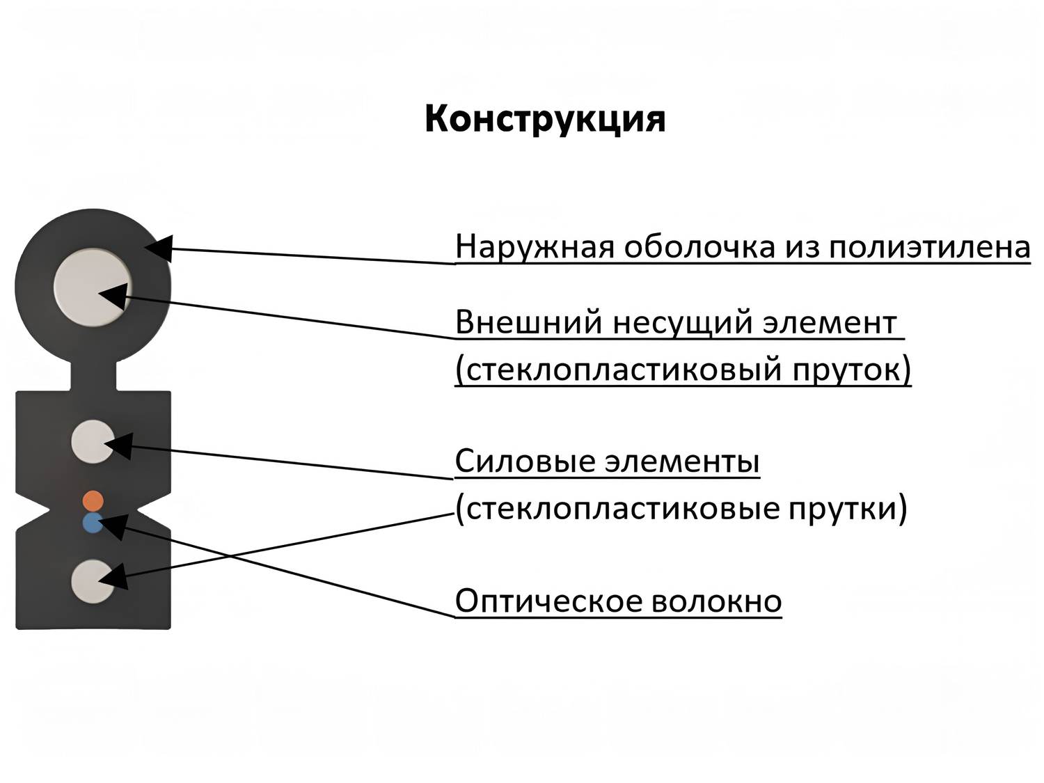 Кабель содержит оптический модуль со свободно уложенными волокнами. Свободное пространство в оптическом модуле заполнено гидрофобным гелем. В качестве силовых элементов используются два диэлектрических стержня. На оптический модуль и силовой элемент накладывается оболочка из полиэтилена.