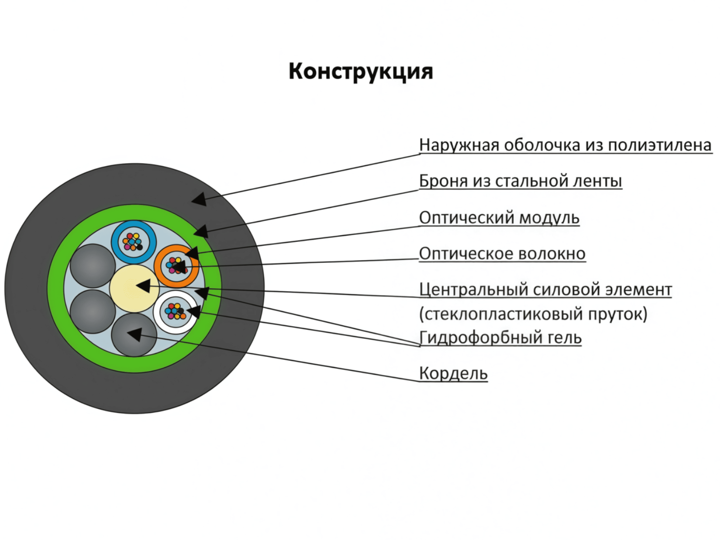 Кабель содержит сердечник модульной конструкции с центральным силовым элементом из диэлектрического стержня, вокруг которого скручены оптические модули со свободно уложенными волокнами. Свободное пространство в оптических модулях и в сердечнике кабеля заполнено гидрофобным гелем. На сердечник накладывается броня из гофрированной стальной ленты и оболочка из полиэтилена.