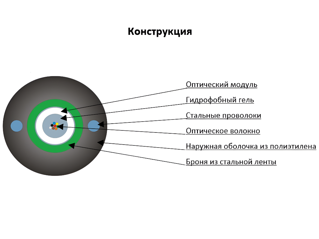 - Центральная трубка из полимерного материала (ПБТ) со свободно расположенными волокнами. Свободное пространство между волокнами заполнено гидрофобным компаундом.